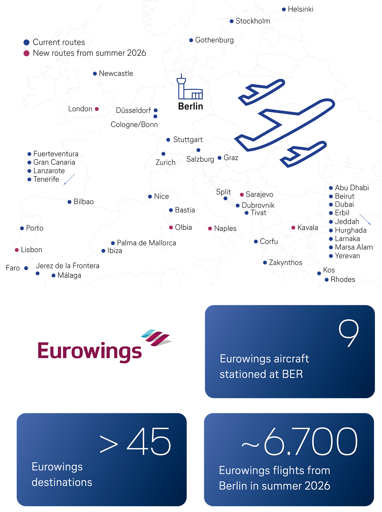 | | | | Berlin and the Lufthansa Group share an almost 100-year history. In 1926, the first Lufthansa was founded here. Today, the Group’s airlines hold a market share of around 30 percent at Germany’s capital airport – no other company has a stronger presence there. More connections, more choices While other airlines, most recently Qatar Airways, are reducing services despite existing traffic rights, Eurowings is expanding its presence at BER more strongly than ever before. In line with the Lufthansa anniversary, new direct flights to London, Lisbon, and Sarajevo will be added to the schedule from summer 2026. Up to twelve weekly flights will then connect the Spree to the Thames. Also new in the program are Olbia, Naples, and Kavala. With more than 45 destinations in 20 countries, the Eurowings summer flight schedule 2026 offers a record selection for the capital region. Frequencies to popular holiday destinations such as Mallorca, Split, Faro, and Larnaca will also be increased. Eurowings is expanding faster at BER than at any other German airport. Two additional aircraft will be stationed, increasing the fleet to a total of nine aircraft. This strengthens the business location Berlin-Brandenburg and creates new jobs locally. The relief measures for aviation recently decided by the federal government support this development and help stabilize and partially expand services on European routes. More comfort for passengers Eurowings is not only investing in its route network but also in an improved travel experience. With the new Premium BIZ Seat, passengers on the Berlin–Dubai route have been enjoying enhanced comfort, privacy and service since November. This makes flying even more attractive for guests from Berlin. | |