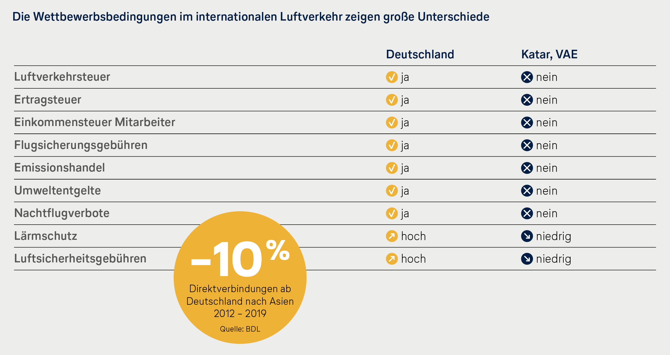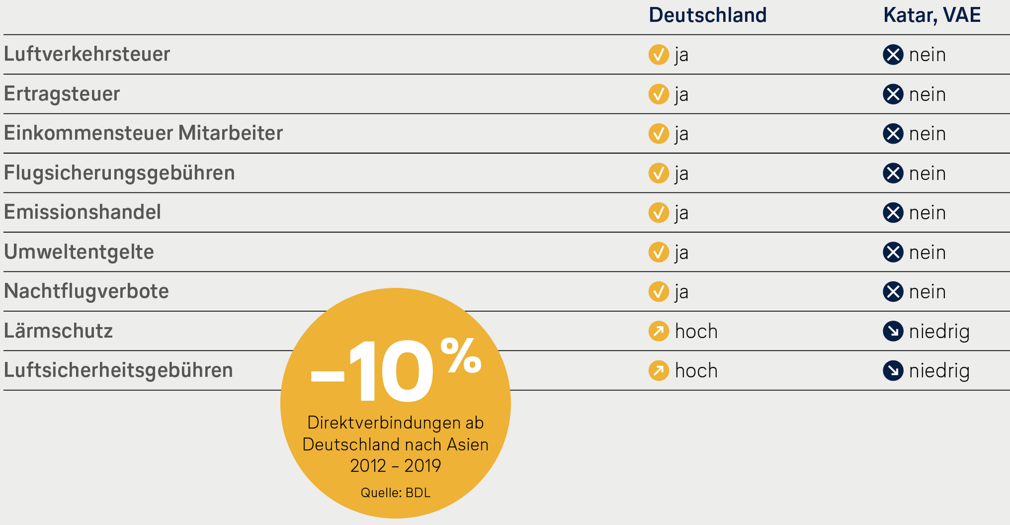 Regelmäßig evaluiert der Bundesverband der Deutschen Luftverkehrswirtschaft (BDL) die Auswirkungen der Luftverkehrsteuer. Der letzte Bericht vom November 2018 unterstrich einmal mehr die wettbewerbsverzerrende Wirkung – die mit der Steuererhöhung nochmals zulegen wird.
