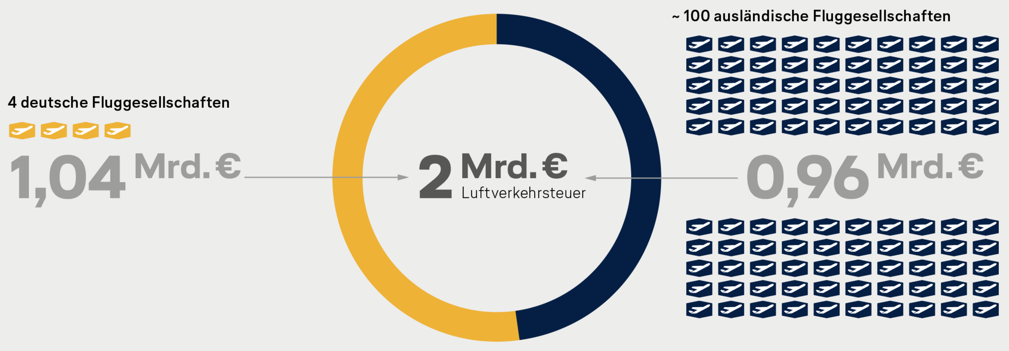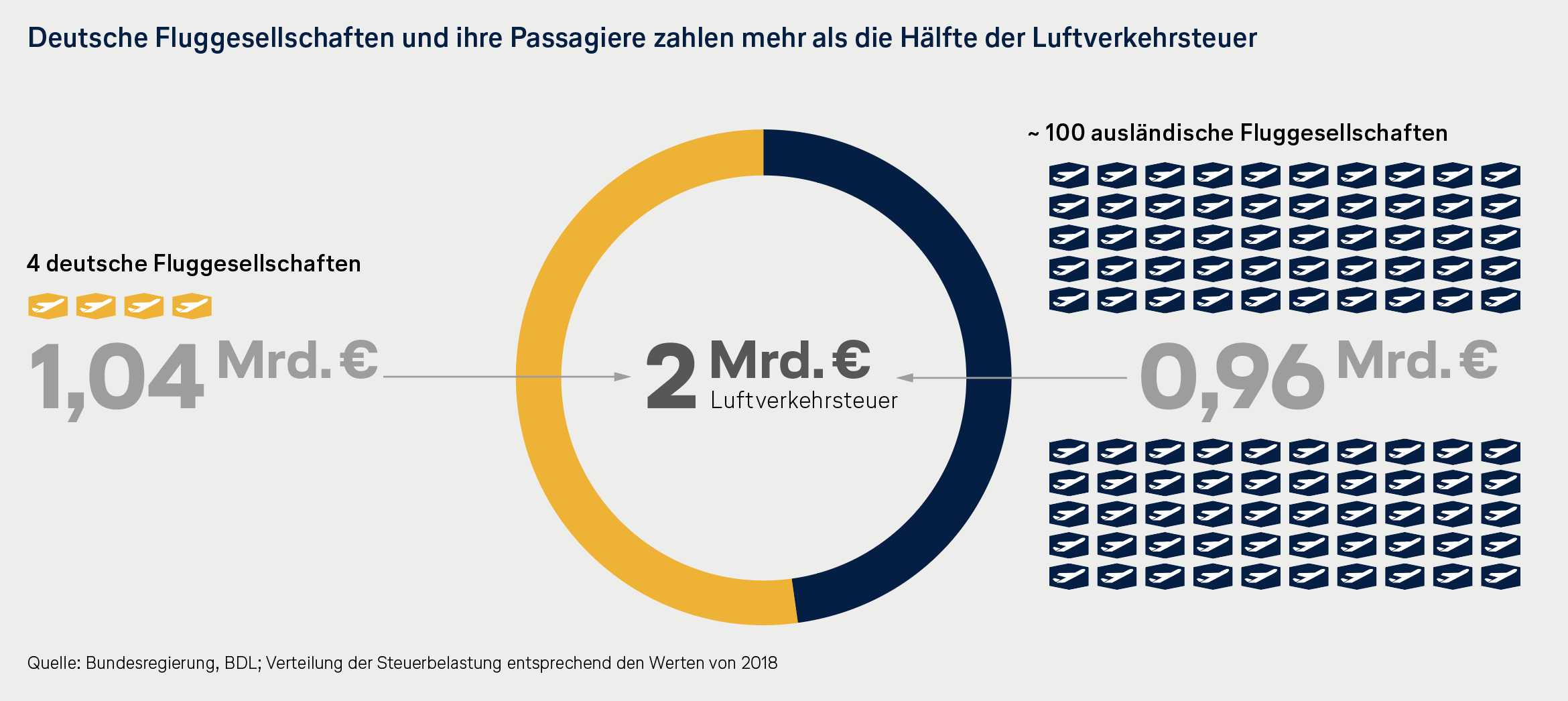 Die Bundesregierung hat im Koalitionsvertrag zugesagt, nationale Belastungen im Luftverkehr abzubauen. Tatsächlich passiert das Gegenteil: Das Kabinett hat im Klimaschutzprogramm beschlossen, die Luftverkehrsteuer massiv anzuheben. Demnach sollen die Steuereinnahmen von derzeit rund 1,2 Milliarden Euro um weitere rund 780 Millionen pro Jahr steigen.